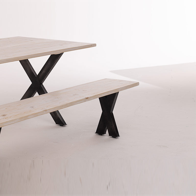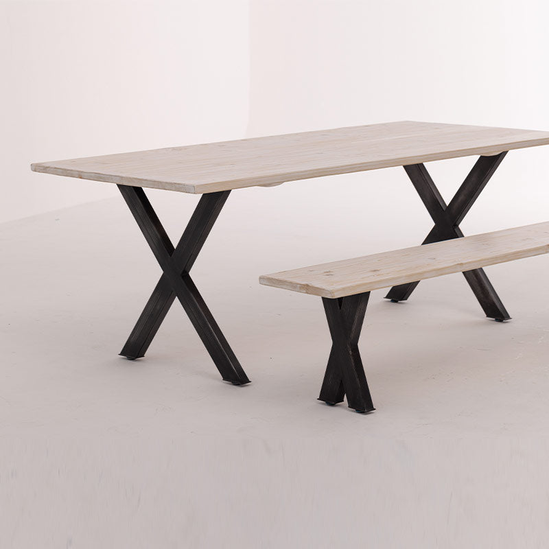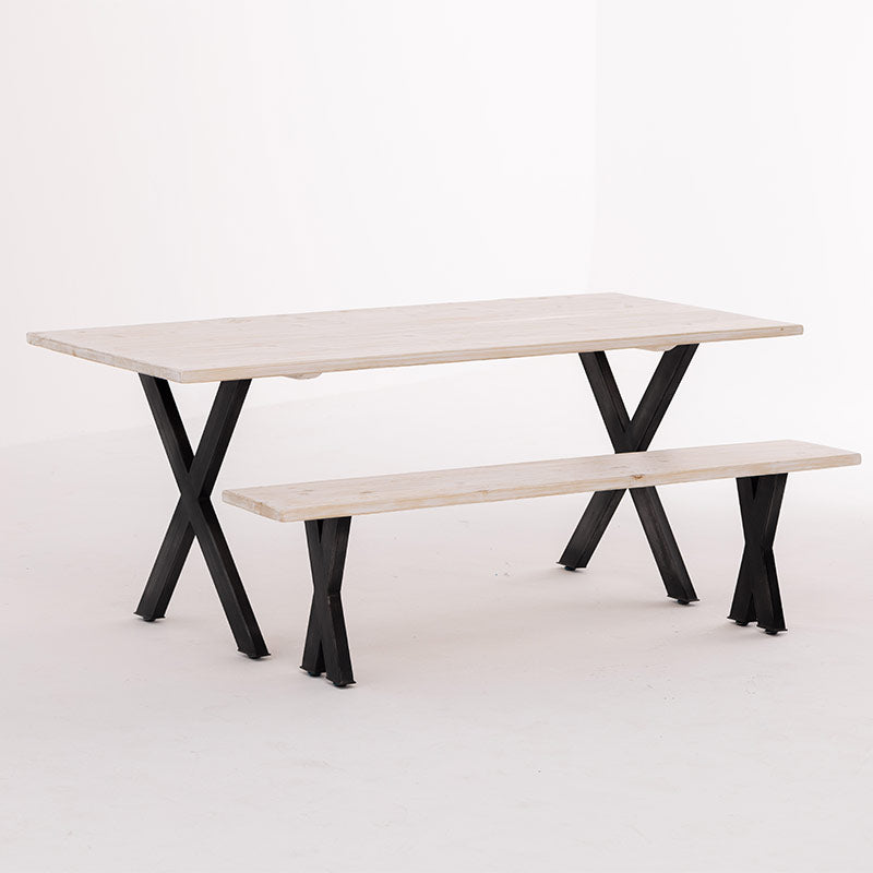 A light wood dining set with a table and matching bench supported by black metal X-legs, combining rustic charm with industrial appeal.