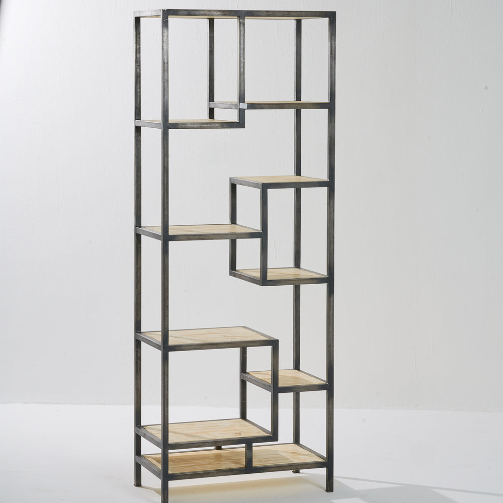 A tall geometric metal frame bookshelf with natural wood shelves, offering an artistic and functional storage solution.