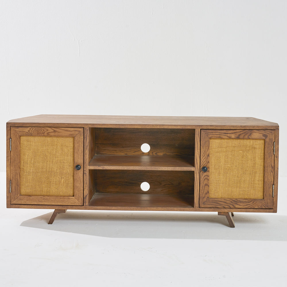 A mid-century inspired TV cabinet featuring two rattan textured doors and open shelving with rear cable management holes.