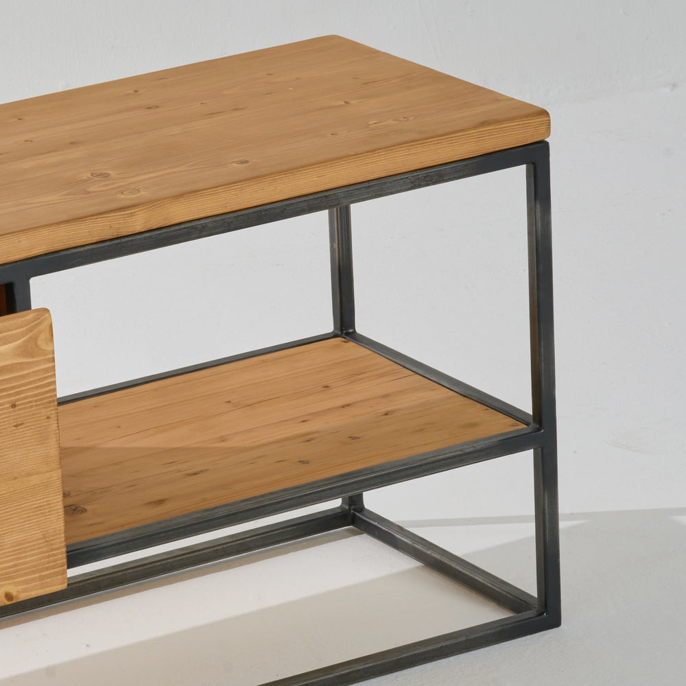 A stylish wooden TV console with an open shelf and single pull-out drawer encased in a sleek metal frame.